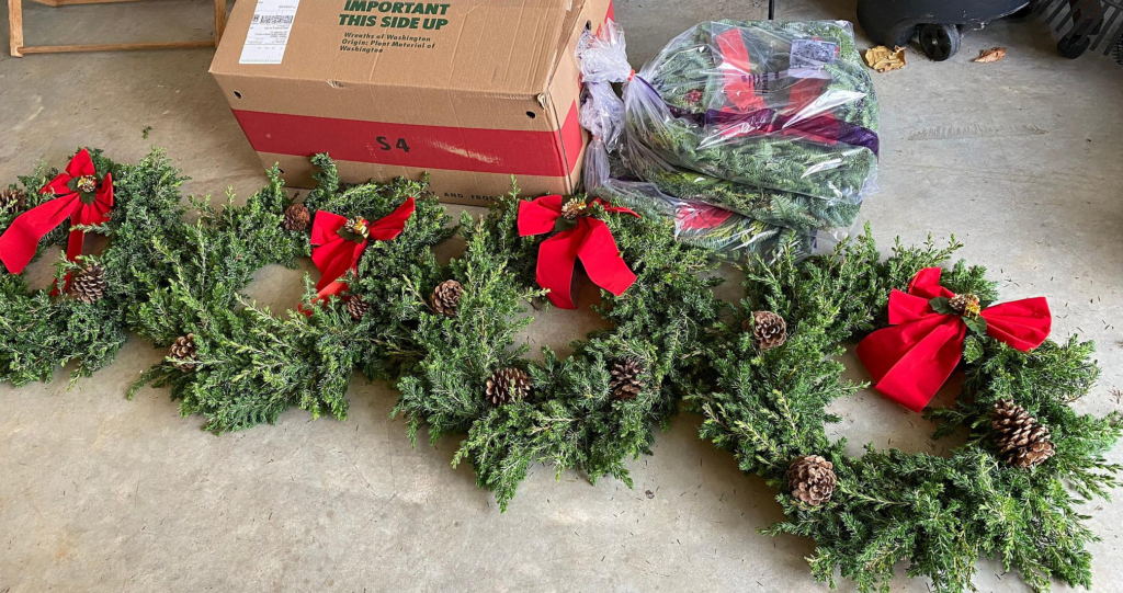 December 9, 2021 –The Kiwanis Club of Charlottesville did its holiday fundraiser slightly differently this year. As far as anyone knows, this was the first time in more than 85 years that we did not sell Christmas trees. But through the month of October, we took orders for beautiful wreaths, garlands, centerpieces, and swags provided by Sherwood Forest Farms in Seattle, Washington. This company had provided greenery for the Albemarle High School Key Club’s annual holiday fundraiser for many years before the club decided to stop doing this just a few years back. Our order was placed by Past President Teresa Tyler on November 1. Club board member Sean Horn was cited for having sold, by far, the most greenery. Those members who were not able to sell greenery were encouraged to make a financial donation in support of this project.