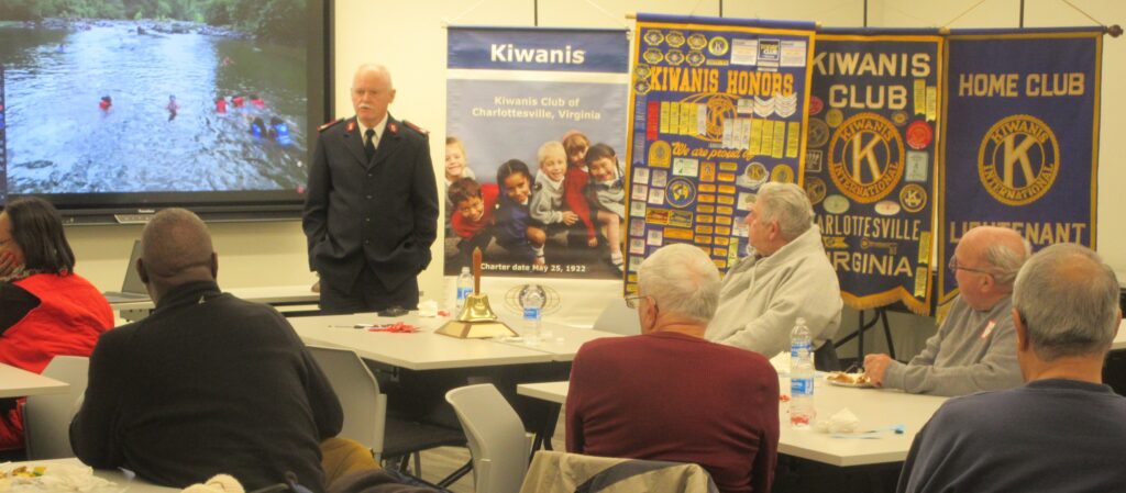 On Monday evening, December 15, Salvation Army Major Donald Wilson presented the program for the club’s general meeting at The Center at Belvedere. Major Wilson applauded the year-round partnership Kiwanis has with Salvation Army in providing help to those friends and neighbors in desperate need in our community. He gave an excellent report specifically on the wholesome and exciting Salvation Army Camp Rappahannock (formerly Camp Happyland) which Kiwanis has designated as one of the main beneficiaries of its fund-raising projects for the past two years.