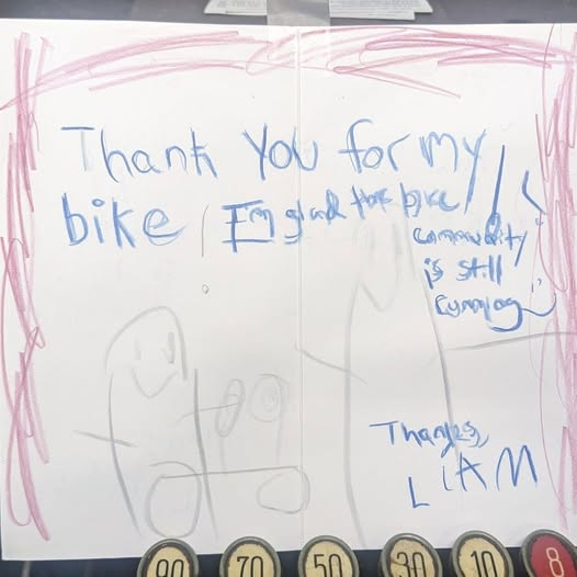 As the year wraps up, moments like this remind us why we do this work. A few weeks ago, a mom came in with her two kids looking for bikes. We found one right away, but couldn’t find another that fit her second child. He started to tear up. Just then, another family walked in to donate a bike their child had outgrown. Minutes later, it was heading home with its new owner, Liam — after a round of high fives in the shop. The thank-you note Liam mailed us is now hanging above our register, and it’s a daily reminder of why this work matters.